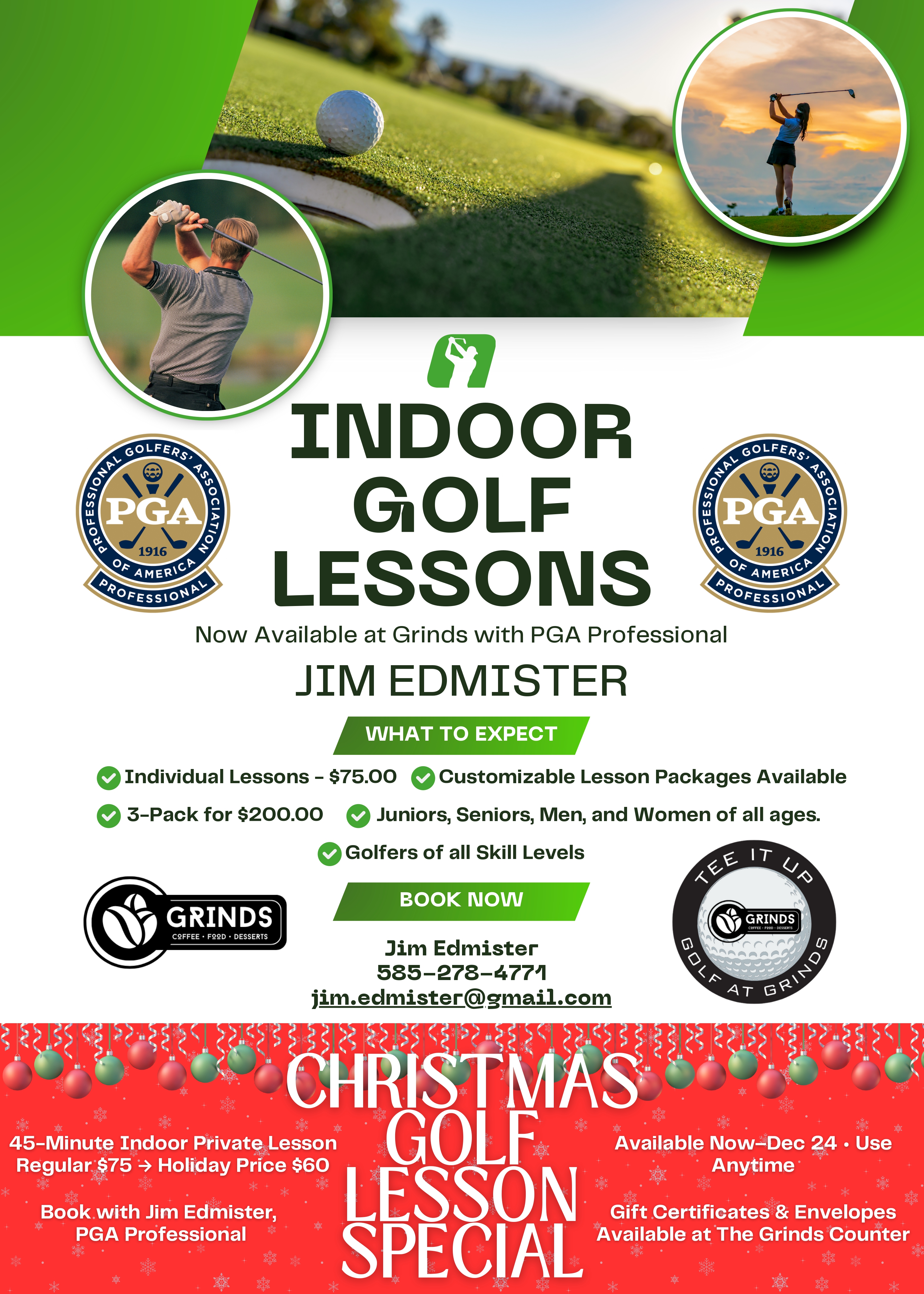 Give the gift of better golf! Enjoy a 45-minute private indoor lesson with PGA Professional Jim Edmister for the holiday rate of just $60. Gift certificates and envelopes are available at Grinds. Book now and use anytime through December 24.